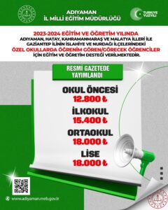 2023-2024 eğitim öğretim yılında Adıyaman, Hatay, Kahramanmaraş ve Malatya illeri ile Gaziantep ilinin iki ilçesindeki özel okullarda öğrenim gören/görecek öğrencilere verilecek eğitim öğretim desteğine dair e-Kılavuz yayımlandı.